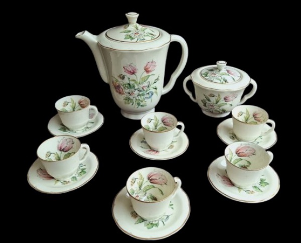 • LIMOGES - Serviço de café, composto de grande  bule,  grande açucareiro, 6  (seis) xícaras de café e pires, em fina porcelana francesa Limoges, com delicada decoração floral, marcada na base Théodore Haviland,  "Décor de Jolaup Patry-Bié". Criada pela artista Solange Patry-Bié . Uma das xícaras apresenta bicado e trincado.  Medida do bule 21 cm.