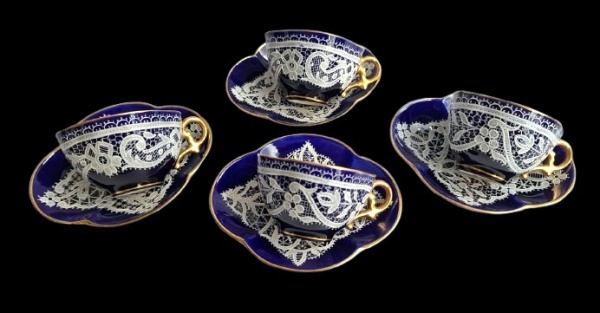 • Lote contendo 4 (quatro) xícaras  de café  tipo Demitasse, em  porcelana  de Renda Veneziana, num padrão esmaltado em azul cobalto e detalhes em dourado. Apresenta fios de cabelo e marcas do tempo.