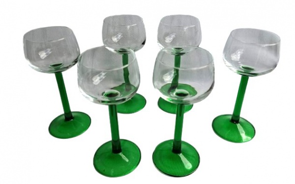 • Lote com 6 taças longas,  para vinho branco de manufatura  francesa,  que  se destacam por sua haste e base na cor verde esmeralda, com o bojo transparente.