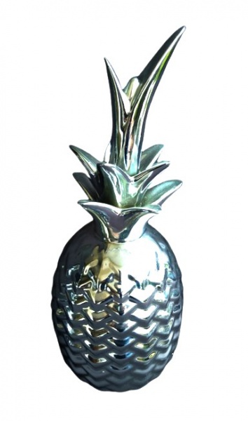 • Elegante abacaxi decorativo em porcelana cromada com riqueza de acabamentos. Medida 30 cm de altura.