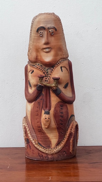 • Tota - Antônio Pascoal Régis (Tracunhaém, PE, 1932 - João Pessoa, PB, 2003). "Mulher". Escultura em terracota modelada, queimada e policromada representando figura feminina. Assinada, datada 97 e localizada PB. 80 cm de altura e 30 de largura