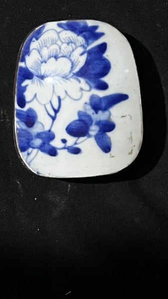 • BELA CAIXA em metal nobre e tampa em porcelana chinesa azul e branco com flores. Medidas: 13,8 cm X 11,0 cm.