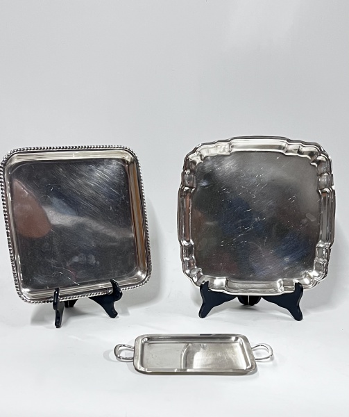 • LOTES CONTENDO 3 BANDEIJAS METAL PRATEADO  MEDIDAS 28X28 /26X26 A MENOR 15X25