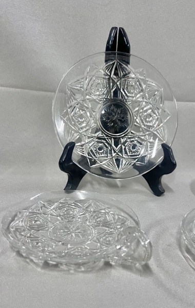 • conjunto composto por 9 recipientes para servir doces, em finíssimo cristal Theco ricamente lapidados com presentoir  medindo 16 de diâmetro e 2 com bicados e outra quebrada (no estado )
