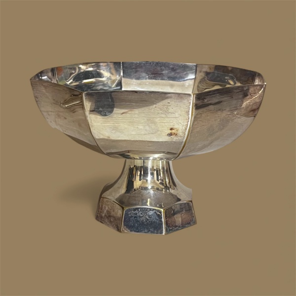 • Fruteira em metal com banho de prata no formato redondo com alça. Mede 23,5 cm de diâmetro e 18 cm de altura. (com marcas de uso