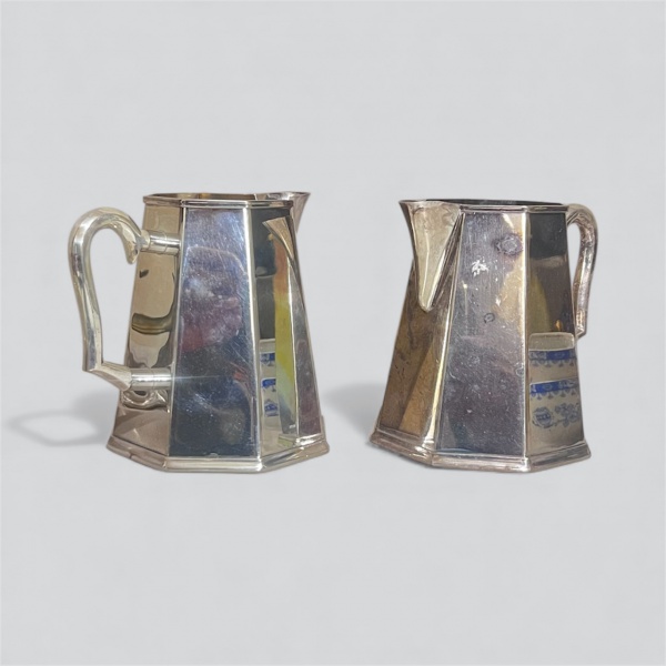 • Par de Elegante jarras  em metal com banho de prata, corpo facetado. Medidas: 17,5 X 10 cm.