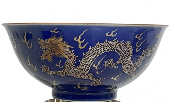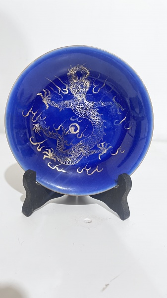 • Tigela azul vidrada, do final da dinastia Qing, com a marca Qianlong.Decorado com dragões perseguindo a pérola flamejante. Diâmetro 17,8 cm.
