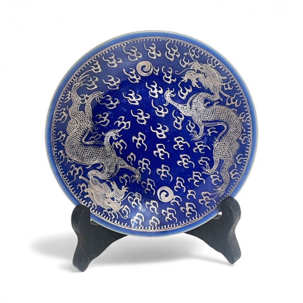 • Prato azul chinês com motivo de dragãoDataDinastia Qing, início do século XVIIIDimensões gerais: Diâmetro: 15,5 cm