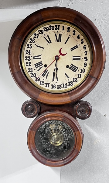 • Relógio ANSONIA de parede feitio "oito", mostrador com algarismos romanos e calendário. Máquina funcionando precisando de ajustes.