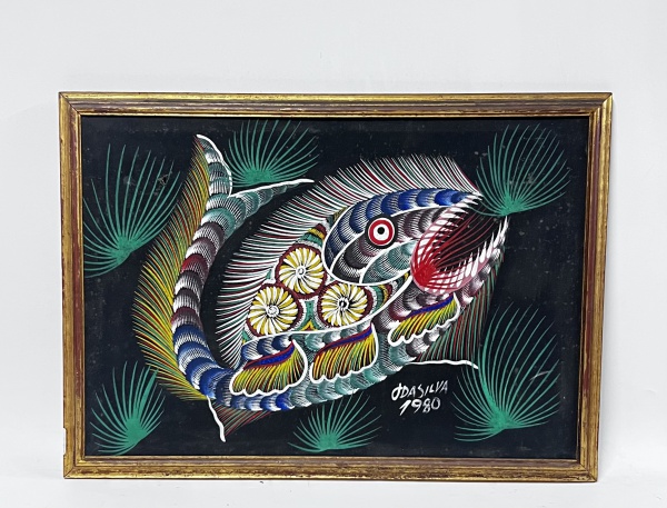 • J da Silva - OST . 1980 . Discípulo e ajudante de atelier do famoso e conhecido artista Chico da Silva. Tela retratando imponente peixe com rica policromia ao gosto do seu professor. Assinada e datada ao centroMedidas : 50.0 cms alt x 70.0 cms larg