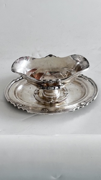 • Belíssima molheira espessurada a prata, manufatura Eberle alpaca modelo conhecido como "lacinho", alças laterais e borda movimentadas ricamente barradas com repuxos de volutas e laçarotes. Meds.:26 x 20