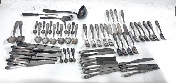• EBERLE - Faqueiro em metal espessurado a prata 90, com 101  Peças decoradas em relevo no cabo com motivos florais, de folhagens e linhas paralelas sendo 12 facas grandes , 2 colheres grandes , 12 facas de sobremesas 11 garfos de sobremesas , 12colheres de sobremesas , 7 facas de peixe , 8 garfos de peixe , 12 colheres de chá , 12 colheres de café , 10 garfos  grandes e 3 talheres