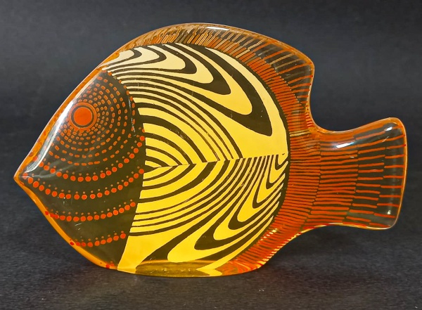 • ABRAHAM PALATNIK Escultura cinética representando peixe vermelho /amarelo em resina de poliéster de manufatura Abraham Palatnik. Medindo 9,5 cm de altura por 13,5 cm de comprimento.