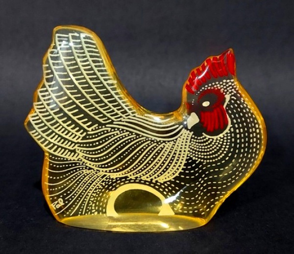 • BRAHAM PALATNIK  Escultura cinética representando galinha bege/vermelho em resina de poliéster de manufatura Abraham Palatnik. Medindo 8,3 cm de altura por 9,5 cm de comprimento.
