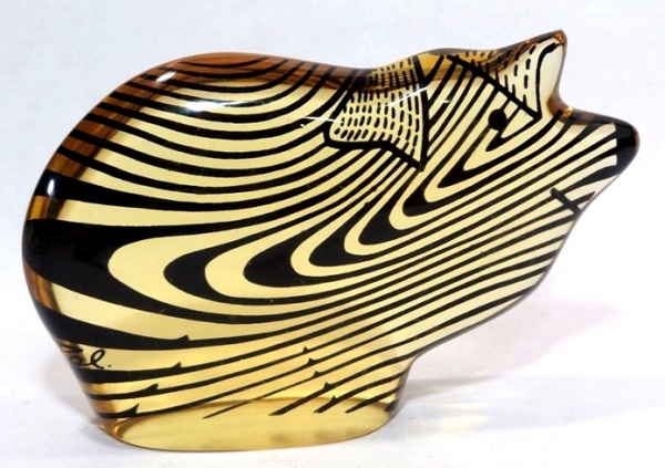 • ABRAHAM PALATNIK  Escultura cinética representando porquinho em resina de poliéster de manufatura Abraham Palatnik. Medindo 7 cm de altura por 10,5 cm de comprimento.