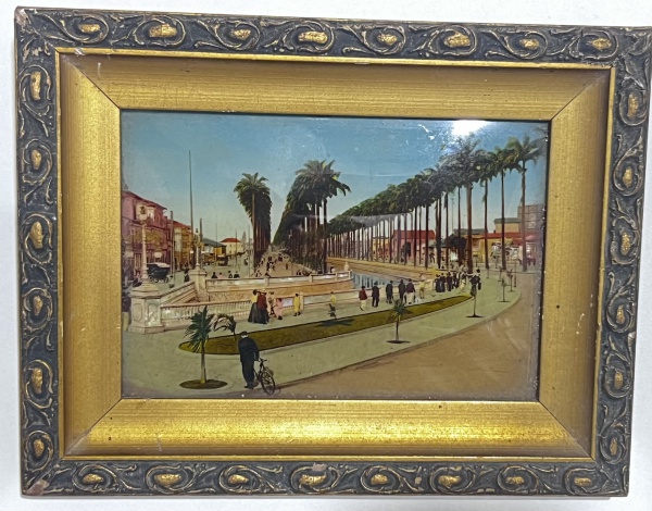 • Panorâmica do Rio de Janeiro. Por sua beleza e qualidade, consideramos uma obra prima, este magnífico panorama iconográfico, que apresenta em primeiro plano o antigo caminho da avenida Niemeyer, originalmente aberto para ligar, por ferrovia, o bairro de Botafogo a Angra dos Reis na costa verde do Rio de Janeiro. A esquerda, o litoral da praia de São Conrado e ao fundo o relevo da Cordilheira da Tijuca, com parte do Morro Dois Irmãos, e a da Pedra da Gávea, uma das montanhas mais altas do mundo junto de margens oceânicas. Óleo sobre tela. Medidas: 38 x 55