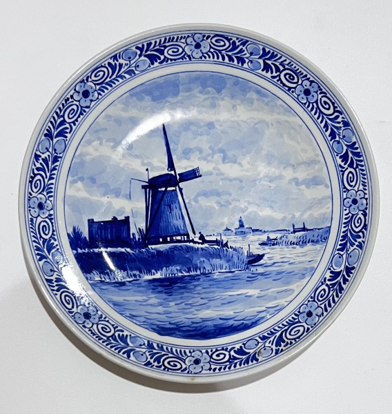 • Medalhão em porcelana holandesa, com marca da manufatura Delft no verso, decorado com paisagem com moinhos de vento em tons de azul. Diâmetro  23 cm