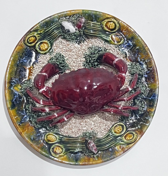 • CALDAS DA RAINHA - Medalhão decorativo em cerâmica policromada, modelada em relevos com decoração de caranguejo e mariscos. Portugal. Século XX. 29 cm de diâmetro. 29 cm.