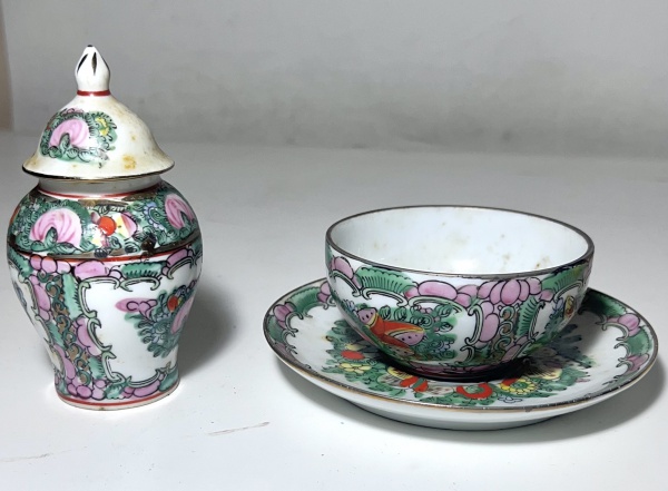 • potiches porcelana chinesa, classificável como "China Exportação". Decoração dita Mandarim. China. Séc. XX. Medindo 10 cm de alt pires 14 cm de diâmetro