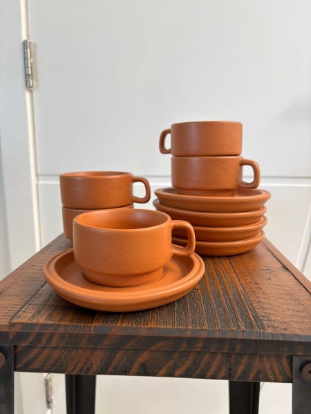 • 5 Xícaras com Pires em Barro Queimado - Med. 10 Alt ( xicaras) X 9 Diam. X 14 Diam. ( Pires ) -