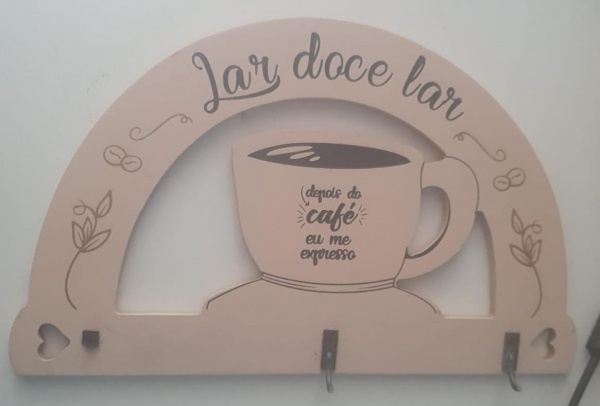 • Enfeite de parede em tom bege, com a frase Lar doce lar e o desenho de uma xícara com o texto Depois do café eu me expresso. Possui três ganchos para pendurar objetos e detalhes decorativos de grãos e ramos de café. - Medidas: