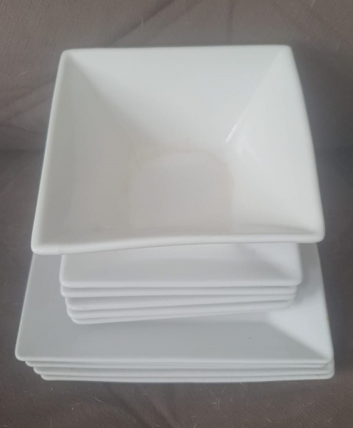 • Pratos brancos quadrados  de sobremesa e pires , feitos em cerâmica , com design moderno e com um bowl.