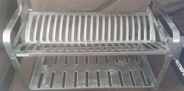 • Escorredor de louça metálico de dois andares, com estrutura vazada para drenagem, espaço superior para pratos e inferior para copos e utensílios.