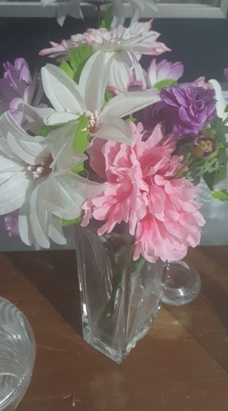 • Arranjo artificial com rosas de tecido , reunidas em um buquê volumoso - Vaso para ilustração.