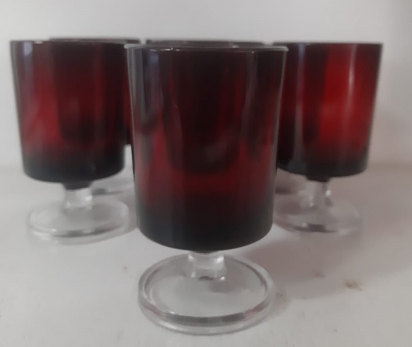 • Sete copos de licor em vidro francês na cor rubi, com base translúcida, marcada FRANCE em seu reverso. Altura: 7 cm