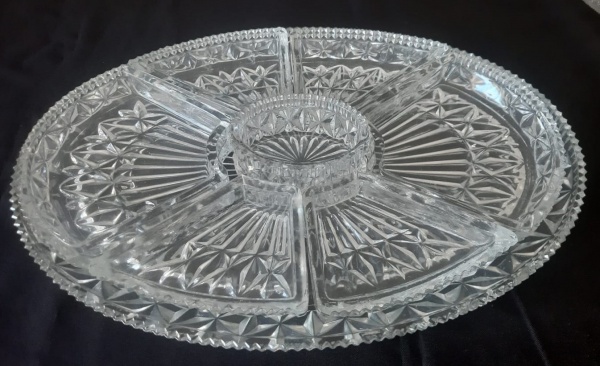 • Petisqueira de cristal lapidado com sete recipientes sobre bandeja oval.- Medidas: 40x28 cm - Lote com lascado na bandeja oval