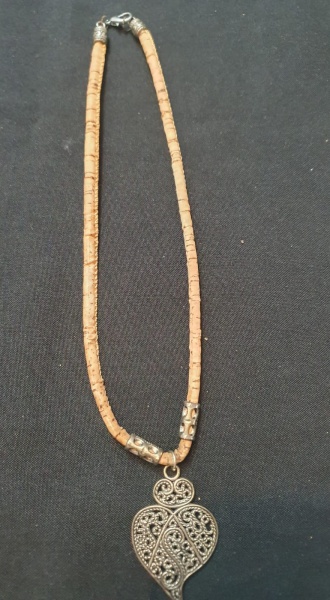 • Cordão artesanal comprado em Portugal, feito com contas cilíndricas em tom bege claro, intercaladas por detalhes metálicos. O pingente é uma peça prateada em formato de coração estilizado, trabalhado em filigrana, que remete à tradição portuguesa. Uma peça rústica e elegante, de inspiração cultural.