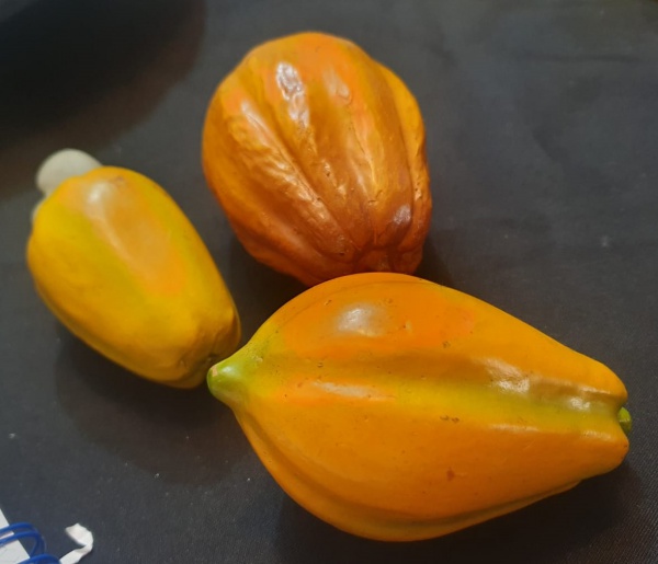 • Conjunto composto por três frutas decorativas artesanais, esculpidas e pintadas à mão, representando espécies tropicais: caju em tom amarelo com castanha acinzentada; cacau em coloração alaranjada com textura marcada; e pimentão amarelo com nuances esverdeadas.Peças elaboradas em material rígido (possivelmente resina ou gesso pintado), de execução artesanal e acabamento minucioso, próprias para composições decorativas de cozinha, mesas temáticas ou coleções de frutas cenográficas.
