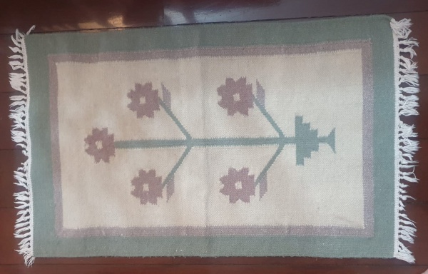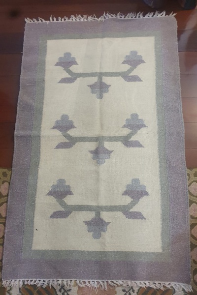 • Tapete tipo runner  retangular, estreito e alongado  em tons delicados: fundo claríssimo com borda verde-clara e detalhes em lilás ou lavanda, decorado com um único motivo vertical que lembra uma haste com botões ou pétalas. Possui franjas simples nas extremidades e textura lisa típica do kilim, indicando técnica de trama plana. Medidas: 92x57 cm