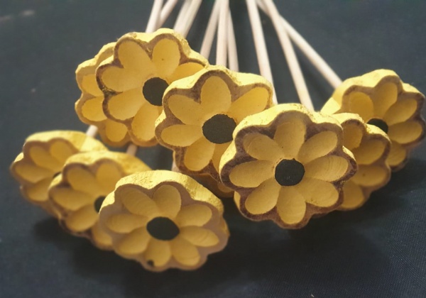 • Conjunto com 10 unidades. Enfeites em formato de margaridas feitas em madeira, com pétalas amarelas, miolo escuro e bordas suavemente realçadas em tom mais escuro. Cada flor é fixada em um palito de madeira, ideal para uso como topper decorativo em doces, bolos, arranjos ou outros artesanatos. Peças delicadas e com acabamento artesanal.Altura: 40 cm.
