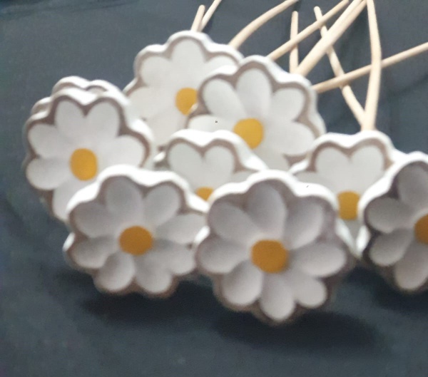 • Conjunto com 10 unidades. Enfeites em formato de margaridas feitas em madeira, com pétalas brancas, miolo amarelo e bordas suavemente realçadas em tom mais escuro. Cada flor é fixada em um palito de madeira, ideal para uso como topper decorativo em doces, bolos, arranjos ou outros artesanatos. Peças delicadas e com acabamento artesanal.Altura: 40 cm.
