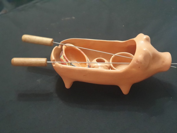 • Travessa para por alimento ou suporte decorativo em formato de porquinho, feito em cerâmica de tom terroso. O corpo do porco é o recipiente principal, oco e alongado, permitindo acomodar utensílios. Dentro dele há pequenos potes de cerâmica, e dois espetos de metal com cabo de madeira estão apoiados na peça.O design é rústico e artesanal, ideal para decoração de cozinha, área gourmet ou uso em pequenas porções e petiscos.