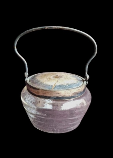 • Pequena biscoiteira em cristal com tampa e alça em metal espessurado a prata. Falta puxador na tampa. Medida 9 cm