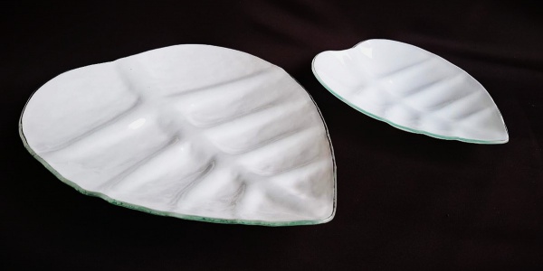• Par de grandes centro de mesa em vidro, representado folhagem doble color. Medidas maior: 35x28cm e menor 24x18cm.